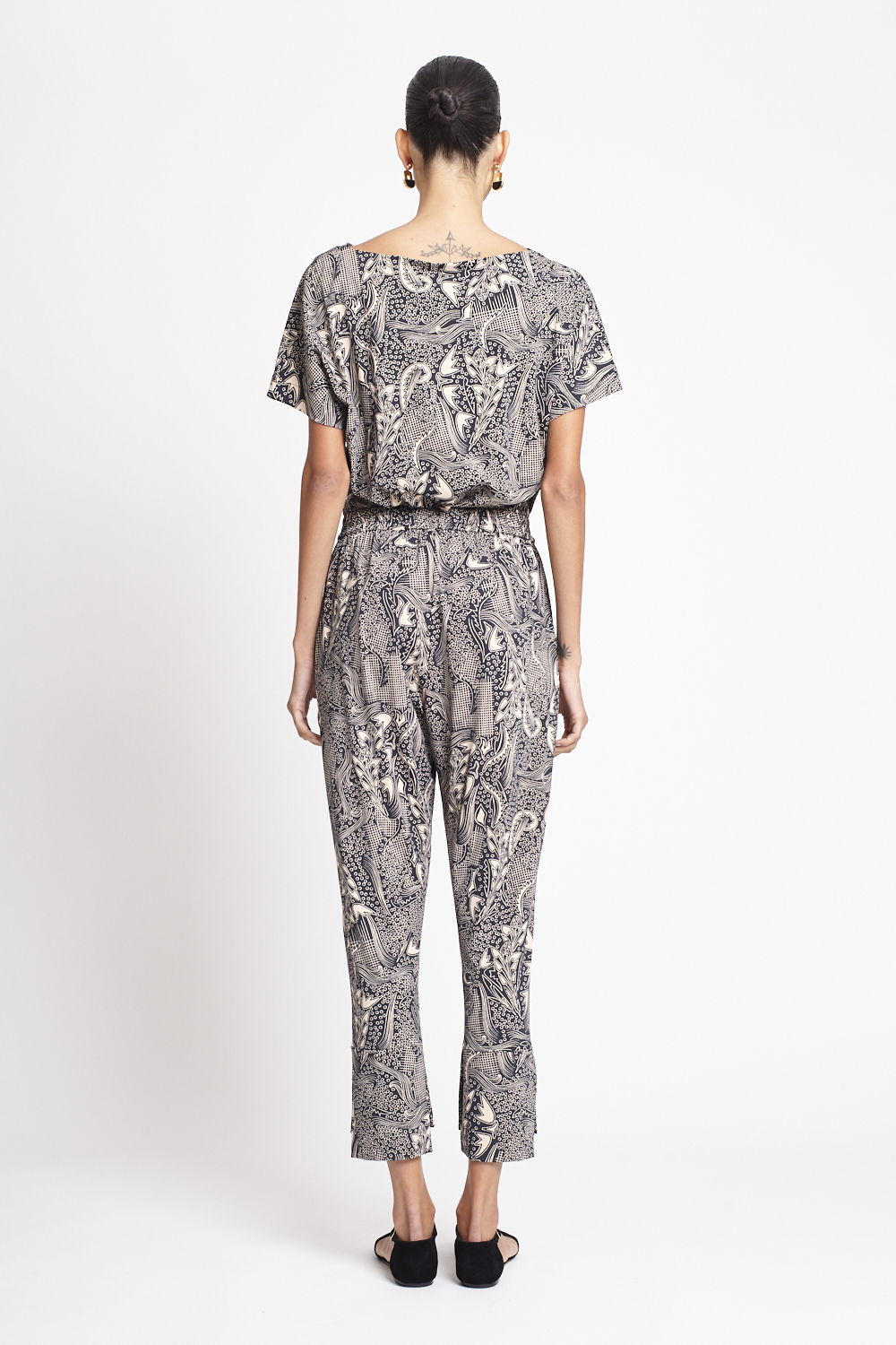 Calça Jersey Estampa Poá, FIT. Confeccionada em jersey estampado. Possui modelagem reta e ajustada ao corpo estilo cenoura, cintura alta, cós reto com sutil elasticidade para melhor ajuste ao corpo, dois bolsos laterais funcionais, barras assimétricas com fendas laterais, estampa decorativa total de tonalidade contrastante, acabamento pespontado clássico e comprimento reduzido.