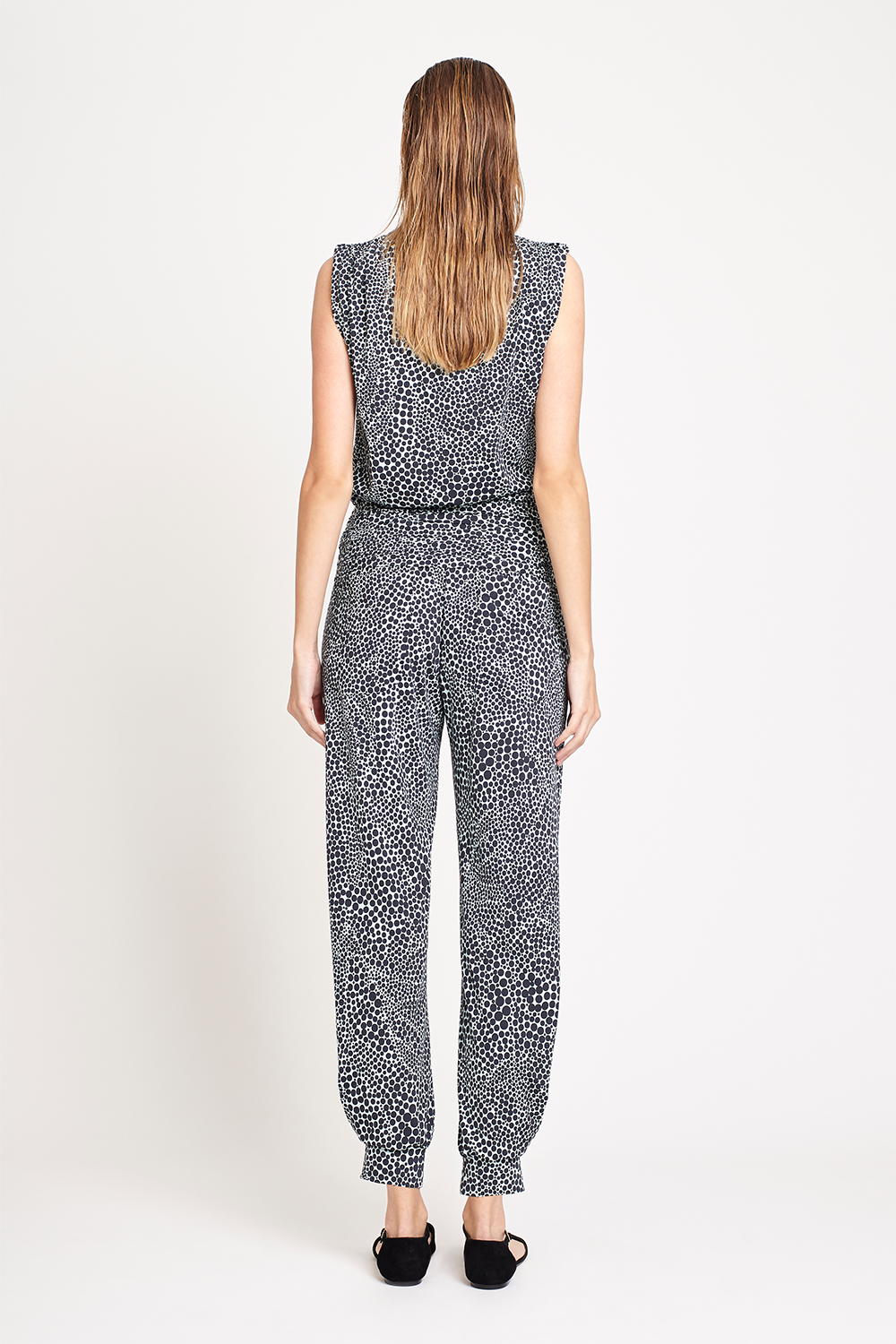 Calça Jersey Estampa Pontos, FIT. Confeccionada em jersey estampado. Possui modelagem reta estilo jogger, cintura alta, cós reto com sutil elasticidade para melhor ajuste ao corpo, pala alongada drapeada, dois bolsos laterais funcionais, pregueado lateral alongado, barras ligeiramente bufantes, punhos inferiores ajustados às pernas, estampa decorativa total de tonalidade contrastante, acabamento pespontado clássico e comprimento reduzido.