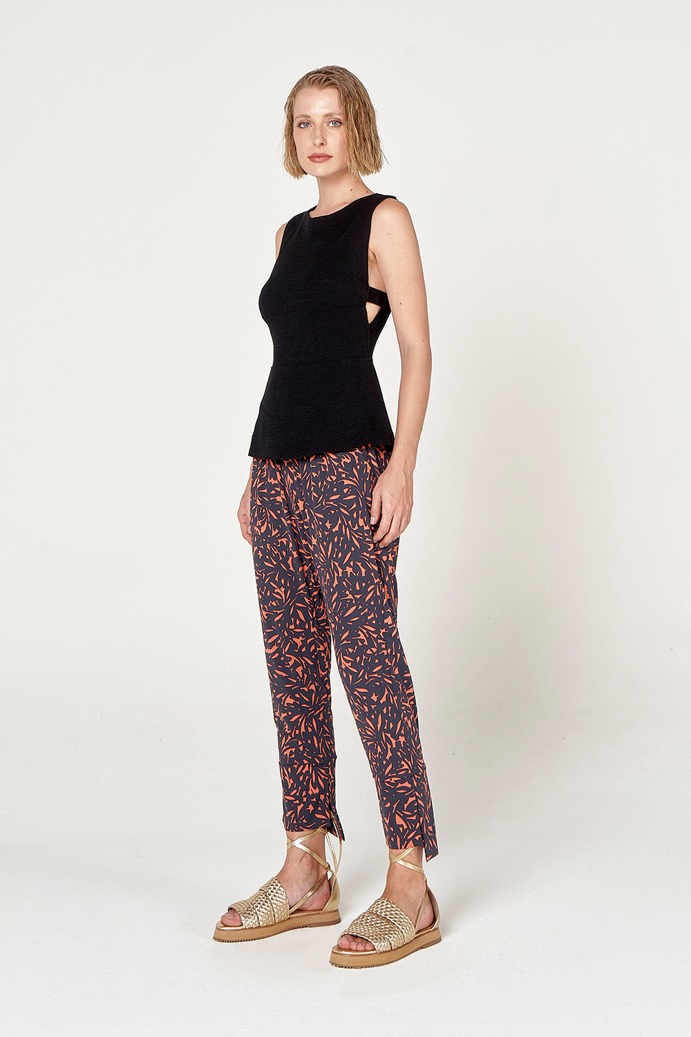 Calça Jersey Floresta Barra Curta Na Frente, FIT. Confeccionada em jersey estampado. Possui modelagem reta, cintura alta, cós reto com sutil elasticidade para ajuste ao corpo, pregas aparentes, dois bolsos laterais funcionais, estampa total de temática botânica, mix de cores contrastantes, acabamento pespontado delicado, barras assimétricas estilo mullet e comprimento curto.