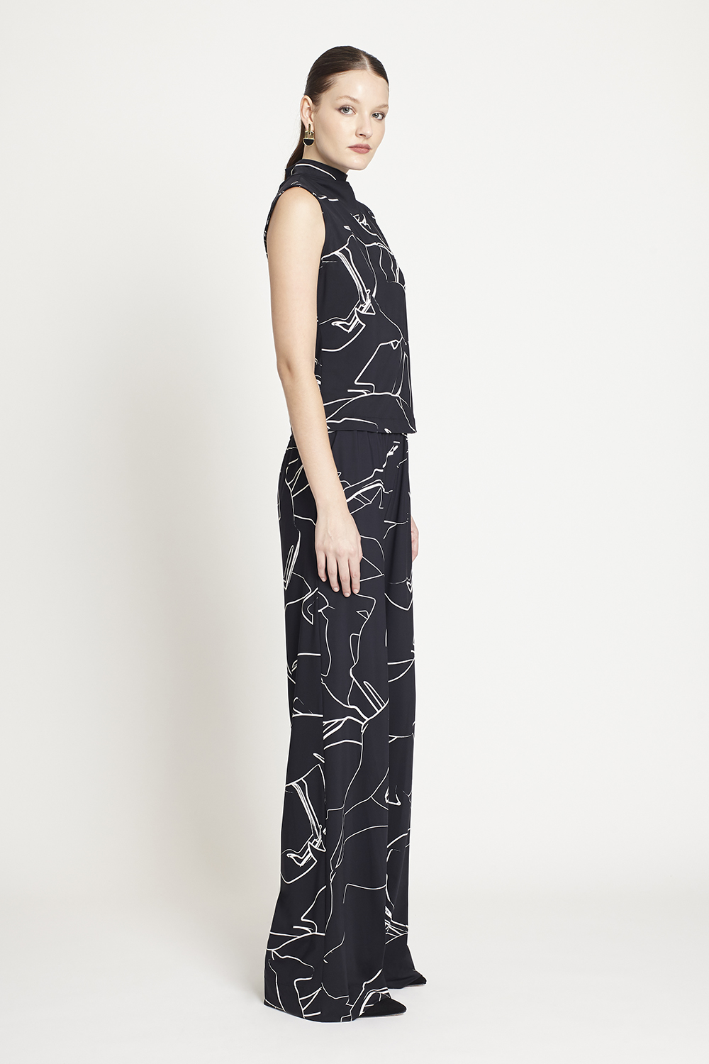 Calça Jersey Linhas, FIT. Confeccionada em jersey estampado. Possui modelagem reta e ampla estilo pantalona, cintura alta, cós reto e estruturado, dois bolsos frontais funcionais, pregas aparentes, estampa total de tonalidade contrastante, barras amplas, acabamento pespontado clássico e comprimento alongado.