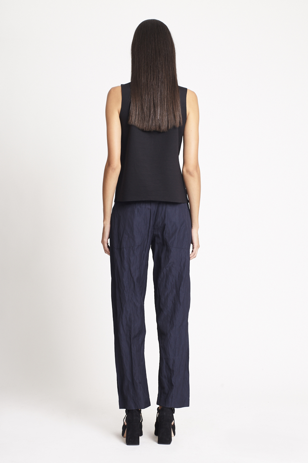 Calça Viscose Metal Bolso Embutido, FIT. Confeccionada em viscose leve e texturizada. Possui modelagem reta, cintura alta, cós reto e estruturado, dois bolsos laterais funcionais, dois bolsos posteriores, recortes aparentes para melhor ajuste ao corpo, textura rugosa total, comprimento reduzido e fechamento frontal.