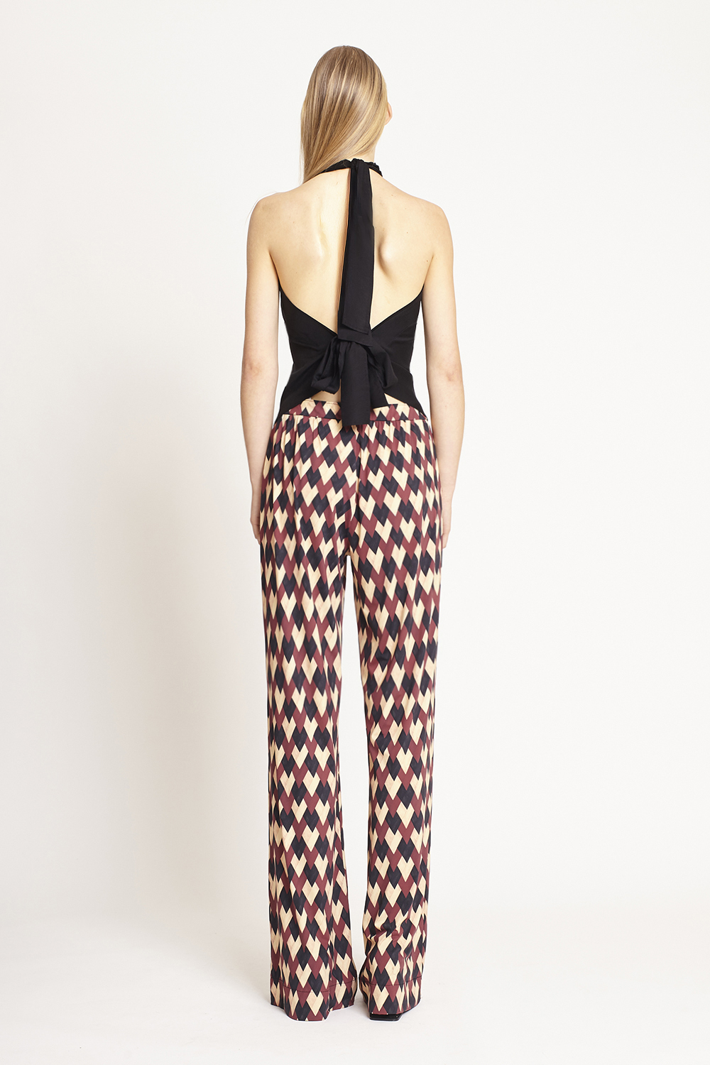 Camisa Jersey Estampa Tressê, FIT. Confeccionada em jersey leve. Possui modelagem reta, decote alongado em 'V' com abotoamento delicado, gola de pontas clássica, mangas 7/8 ligeiramente bufantes com amarração nos punhos, padronagem geométrica total com mix de cores contrastantes, acabamento pespontado clássico e comprimento regular.