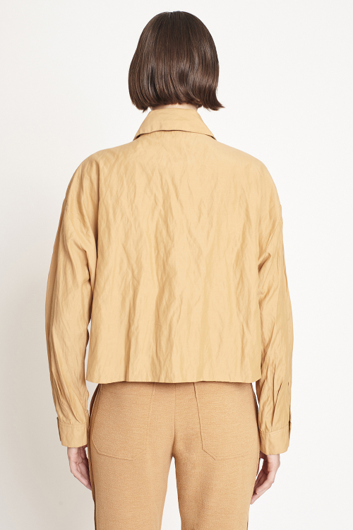 Jaqueta Viscose Metal Curta, FIT. Confeccionada em viscose leve e texturizada. Possui modelagem reta, gola de pontas clássica, cavas deslocadas, mangas longas com pregueado inferior e punhos estruturados, dois bolsos frontais funcionais, textura rugosa total, comprimento regular e fechamento frontal por zíper metálico aplicado.