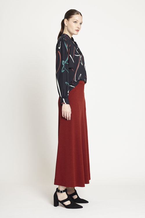 Saia Bouclê, FIT. Confeccionada em bouclê texturizado. Possui modelagem reta em sutil evasê, cintura alta, cós reto e estruturado, recortes geométricos aparentes, leve textura rugosa total, barra à fio e comprimento midi.