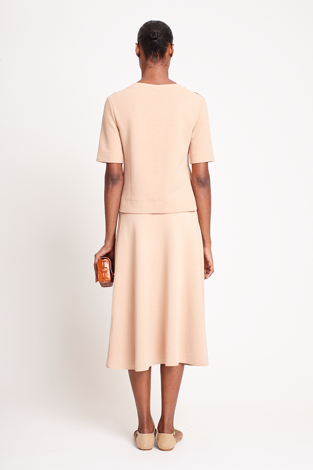 Saia Bouclê, FIT. Confeccionada em bouclê texturizado e encorpado. Possui modelagem evasê, silhueta em leve 'A', cintura alta, cós reto com sutil elasticidade para melhor ajuste ao corpo, leve textura rugosa total, acabamento pespontado clássico, detalhes à fio e comprimento midi.