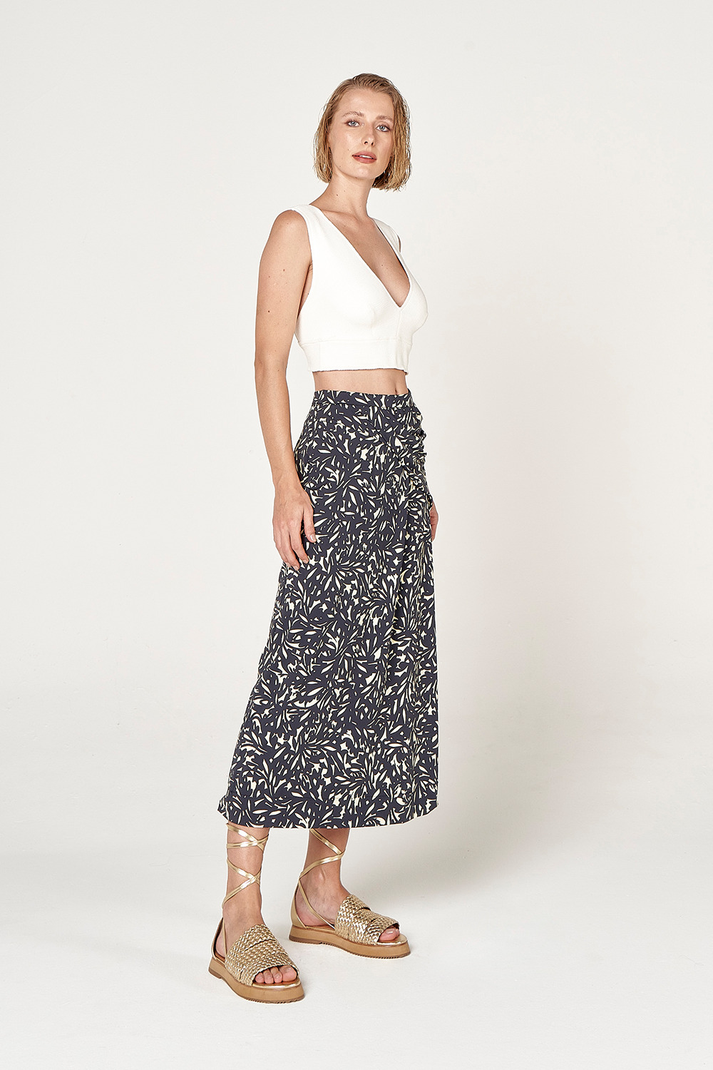Saia Jersey Estampa Floresta Pregas No Cós, FIT. Confeccionada em jersey estampado. Possui modelagem reta, cintura alta, cós reto com sutil elasticidade para ajuste ao corpo, drapeado lateral com pregas aparentes, nesga lateral alongada para maior fluidez, recorte posterior central para melhor vestibilidade, estampa total de temática botânica, mix de cores contrastantes, acabamento pespontado delicado e comprimento midi.