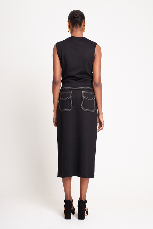 Saia Malha Dupla Leve, FIT. Confeccionada em malha encorpada. Possui modelagem reta estilo tubinho, cintura alta, cós reto de espessura reduzida, dois bolsos frontais estilo canguru, dois bolsos posteriores amplos, bordados pespontados de tonalidade contrastante, recortes aparentes para melhor ajuste ao corpo, acabamento pespontado clássico, detalhes à fio e comprimento midi.